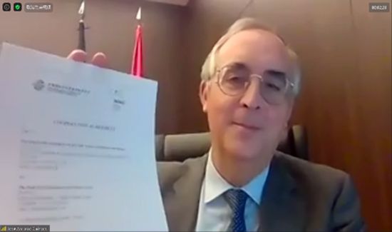 2021年7月8日,中國國際經(jīng)濟(jì)貿(mào)易仲裁委員會(CIETAC)與西班牙馬德里國際仲裁中心(MIAC)通過線上方式舉行了《合作協(xié)議》簽署儀式。貿(mào)仲副主任兼秘書長王承杰先生與馬德里國際仲裁中心主席José Antonio Caínzos先生分別代表雙方在《合作協(xié)議》上簽字。馬德里國際仲裁中心秘書長及馬德里律師協(xié)會國際關(guān)系負(fù)責(zé)人一同出席了本次儀式。