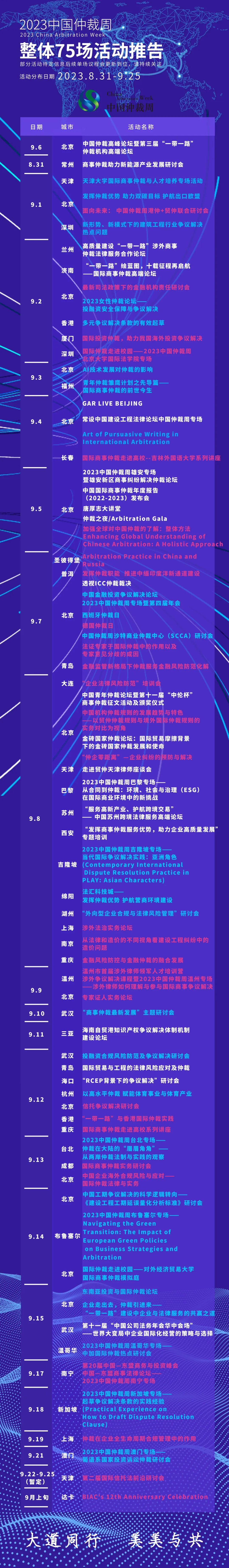 清風(fēng)生,白云遏,臨川筆,彭澤樽。截至今日2023中國(guó)仲裁周整體75場(chǎng)活動(dòng)逐場(chǎng)推告如下: