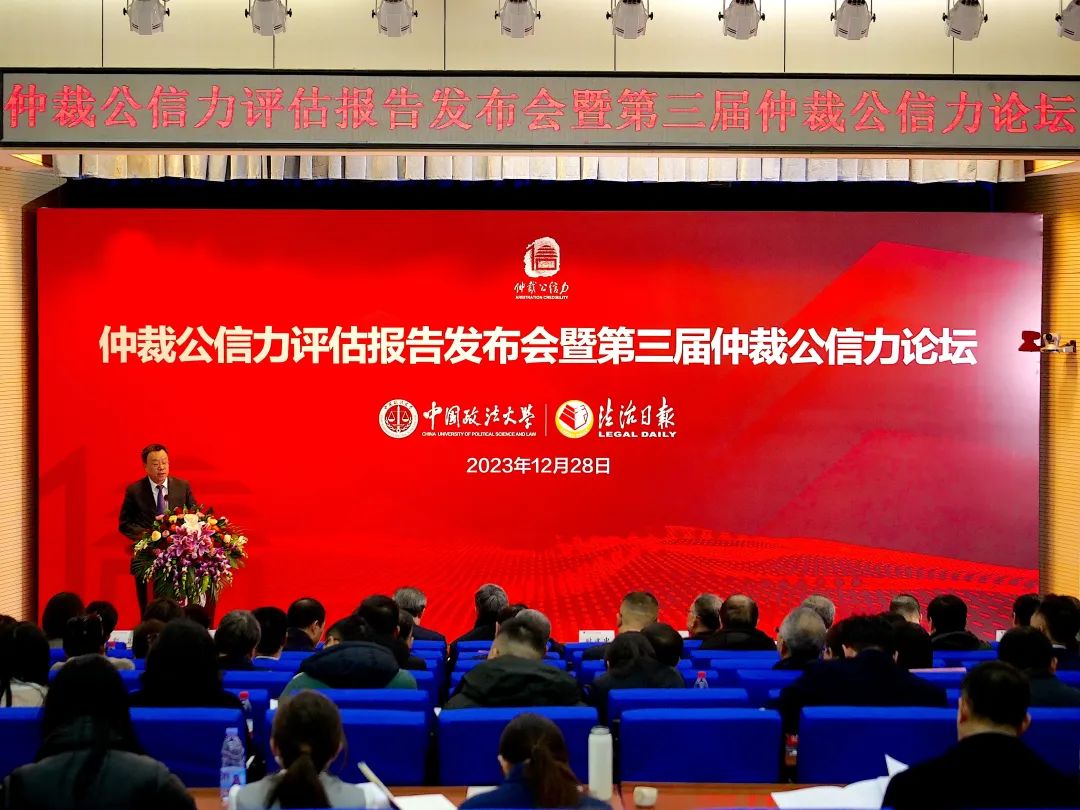 2023年12月28日,仲裁公信力評估報告發(fā)布會暨第三屆仲裁公信力論壇在中國政法大學(xué)舉行。全國人大常委會法制工作委員會民法室副主任馬正平,司法部公共法律服務(wù)管理局局長楊向斌,最高人民法院法官張梅等國家機(jī)關(guān)代表蒞臨發(fā)布會。中國政法大學(xué)副校長時建中,中國法學(xué)會副會長、中國政法大學(xué)仲裁研究院理事長黃進(jìn),全國人大常委會法制工作委員會民法室原主任賈東明,司法部公共法律服務(wù)管理局二級巡視員石海,法制日報社編委、法治網(wǎng)總裁萬學(xué)忠以及專家委員會成員出席發(fā)布會。全國多家仲裁機(jī)構(gòu)領(lǐng)導(dǎo)、律師與企業(yè)代表、高校科研人員以及媒體代表參會。