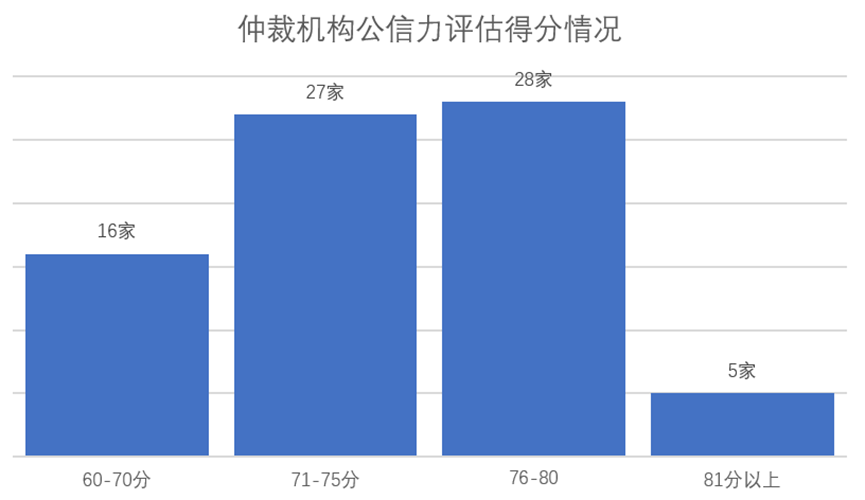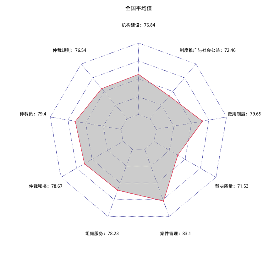 從一級指標(biāo)得分情況來看,受調(diào)研仲裁機(jī)構(gòu)表現(xiàn)較好的指標(biāo)是案件管理。該指標(biāo)主要依據(jù)是仲裁用戶的主觀滿意度評價。這表明機(jī)構(gòu)所在地的當(dāng)事人對本地機(jī)構(gòu)的評價較高。我國仲裁發(fā)展不平衡,仲裁資源本地化程度較高,滿意度指標(biāo)橫向可比性較低。該指標(biāo)主要反映機(jī)構(gòu)所在地當(dāng)事人對該仲裁機(jī)構(gòu)的看法。一級指標(biāo)中得分最低的是仲裁裁決,僅為71.5分。仲裁裁決指標(biāo)的評估標(biāo)準(zhǔn)主要是當(dāng)事人向法院申請撤銷仲裁裁決與仲裁機(jī)構(gòu)受案數(shù)量比、法院實際撤裁與當(dāng)事人申請撤裁案件數(shù)量比以及法院實際撤裁案件與仲裁機(jī)構(gòu)受理案件數(shù)量比。該項指標(biāo)評估依據(jù)來源權(quán)威,效度較高,可以部分反映仲裁公信力建設(shè)的實際情況。