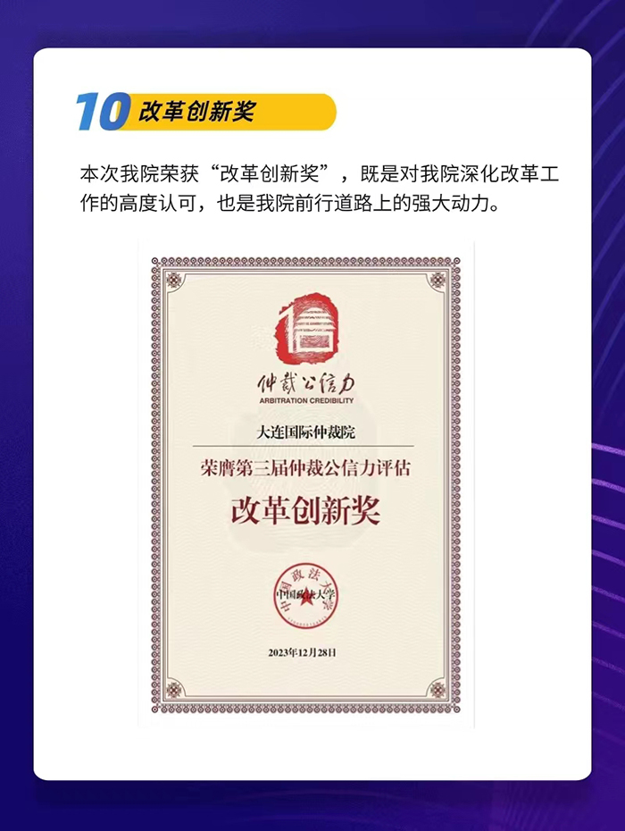 歷史的畫卷,在砥礪前行中鋪展;時(shí)代的華章,在接續(xù)奮斗中書寫。展望2024,大連國(guó)際仲裁院將在遼寧省大連市委、市政府的堅(jiān)強(qiáng)領(lǐng)導(dǎo)下,始終秉持鑄造公信力的價(jià)值理念,以滾石上山、負(fù)重前行的決心抓發(fā)展,以“高質(zhì)量、高效率、高服務(wù)水平”的三高標(biāo)準(zhǔn)為抓手,創(chuàng)新工作機(jī)制,著眼隊(duì)伍建設(shè),拓寬服務(wù)領(lǐng)域,搭建服務(wù)平臺(tái),努力營(yíng)造優(yōu)質(zhì)的仲裁法治環(huán)境,最大程度化解社會(huì)矛盾,實(shí)現(xiàn)大連仲裁事業(yè)的新跨越、新發(fā)展、新輝煌。