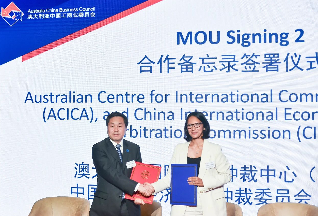 2024年4月15日,在中國(guó)貿(mào)促會(huì)會(huì)長(zhǎng)任鴻斌率中國(guó)企業(yè)家代表團(tuán)訪(fǎng)問(wèn)澳大利亞期間,由中國(guó)貿(mào)促會(huì)和澳中工商業(yè)委員會(huì)共同主辦的中國(guó)-澳大利亞商務(wù)研討會(huì)在澳大利亞悉尼舉行。中國(guó)國(guó)際經(jīng)濟(jì)貿(mào)易仲裁委員會(huì)(以下簡(jiǎn)稱(chēng)“貿(mào)仲”)副主任兼秘書(shū)長(zhǎng)王承杰與澳大利亞國(guó)際商事仲裁中心主席喬治婭·奎克(Georgia Quick)在悉尼簽訂了合作協(xié)議。