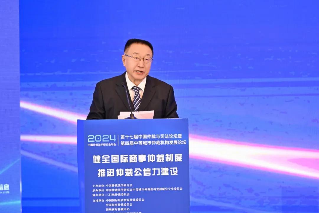 (中國國際貿(mào)易促進(jìn)委員會黨組成員、副會長、中國仲裁法學(xué)研究會會長于健龍作開幕致辭)