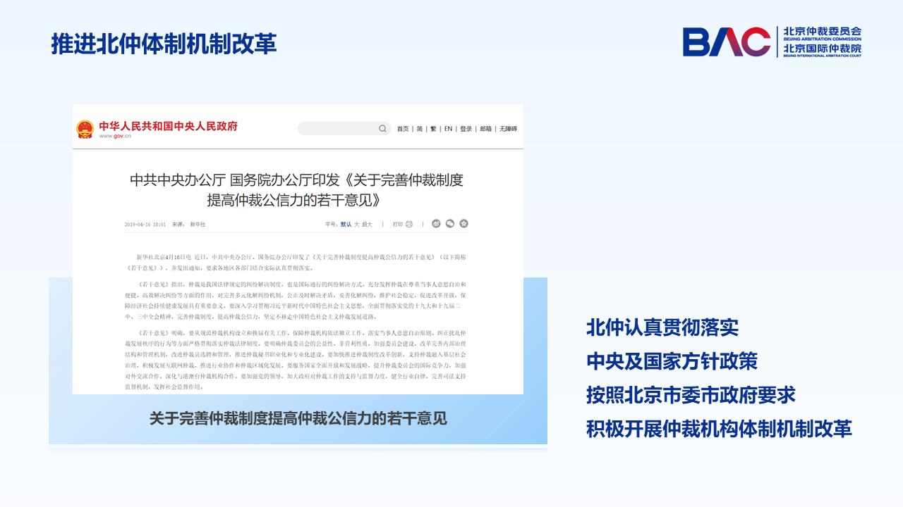 為了打造國際一流的仲裁機構(gòu)以支撐國際商事仲裁中心建設(shè),北仲認真貫徹落實中央及國家方針政策,按照北京市委市政府要求積極開展仲裁機構(gòu)體制機制改革。