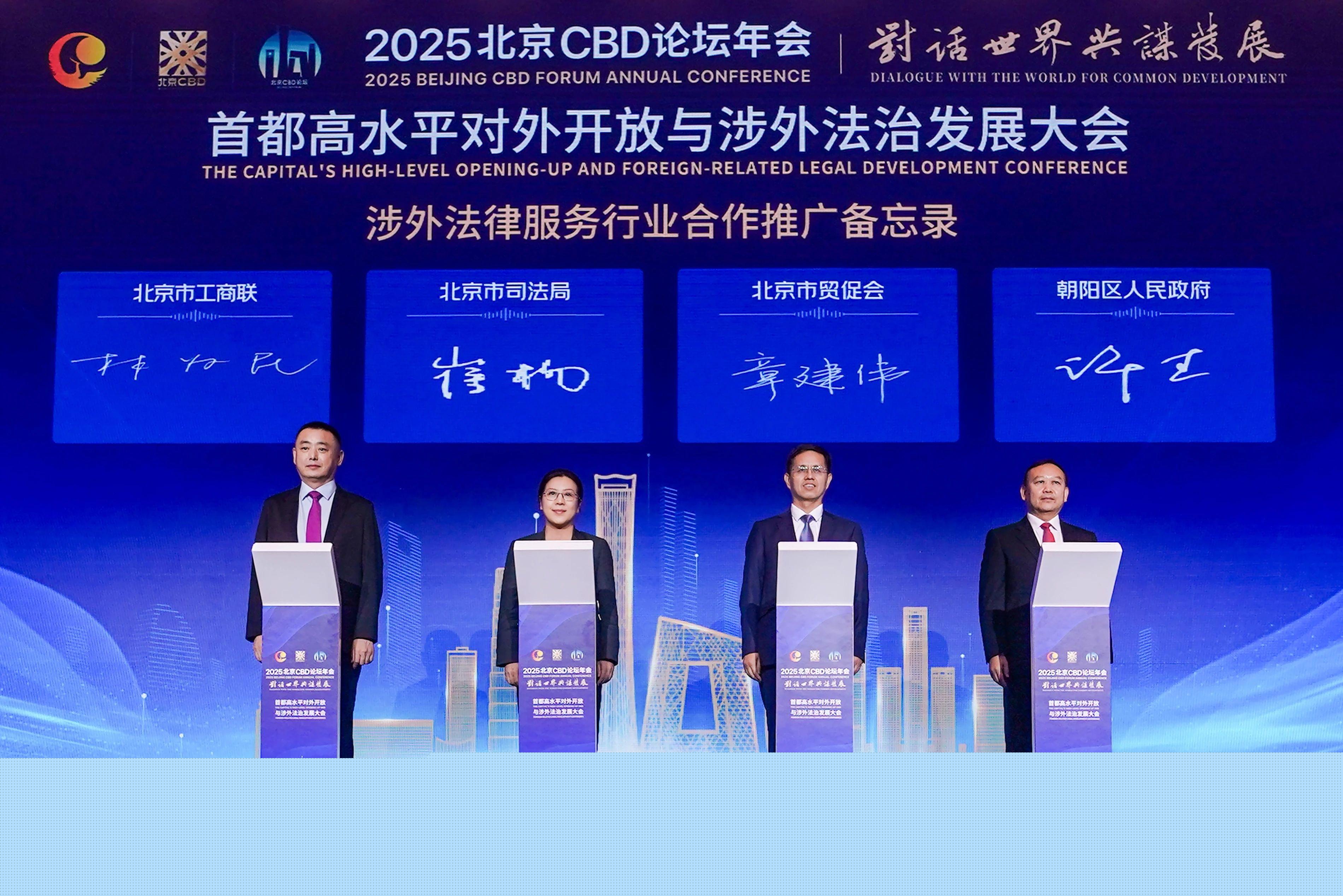 北京市司法局、朝陽區(qū)人民政府、北京市貿(mào)促會、北京市工商聯(lián)圍繞涉外法律服務機構(gòu)推介和政策保障事項共同簽署《涉外法律服務行業(yè)合作推廣備忘錄》。