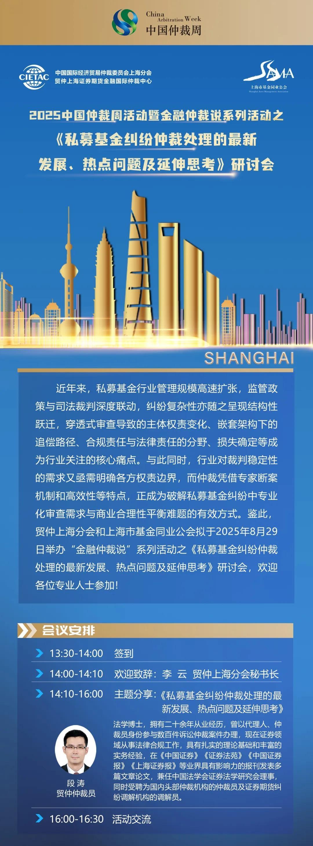 由中國國際經(jīng)濟(jì)貿(mào)易仲裁委員會等單位聯(lián)合發(fā)起的2025年第十三屆中國仲裁周即將拉開帷幕。為進(jìn)一步提升中國仲裁周活動平臺專業(yè)價值與全球影響力,貿(mào)仲上海分會和上海市基金同業(yè)公會將于2025年8月29日舉辦2025中國仲裁周活動暨金融仲裁說系列活動之《私募基金糾紛仲裁處理的最新發(fā)展、熱點問題及延伸思考》研討會,期待各位嘉賓報名參與。