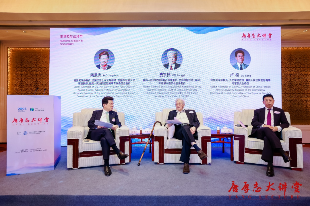 9月16日,由中國國際經(jīng)濟(jì)貿(mào)易仲裁委員會(huì)(簡稱“貿(mào)仲”)主辦的第九屆“唐厚志大講堂”作為中國仲裁周重點(diǎn)活動(dòng)之一在京舉行。最高人民法院審判委員會(huì)原委員,中國國際經(jīng)濟(jì)貿(mào)易仲裁委員會(huì)原副主任、顧問、專家咨詢委員會(huì)主任委員費(fèi)宗祎教授以“中國商事仲裁的發(fā)展與展望”為題作主題演講。貿(mào)仲資深仲裁員、法國巴黎上訴法院律師、美國喬治城大學(xué)兼職教授、最高人民法院國際商事專家委員會(huì)委員陶景洲先生,貿(mào)仲資深仲裁員、外交學(xué)院教授、最高人民法院國際商事專家委員會(huì)委員盧松先生進(jìn)行與談。貿(mào)仲副主任兼秘書長王承杰主持本場活動(dòng)并致辭。來自全球30個(gè)國家和地區(qū)的仲裁機(jī)構(gòu)負(fù)責(zé)人、仲裁員、律師、學(xué)者及工商界人士等近300名海內(nèi)外嘉賓現(xiàn)場參與,超過3000人次線上收看直播。