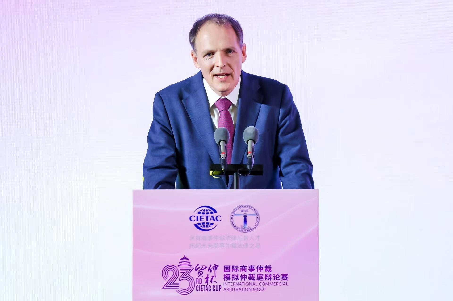 Stefan Kr?ll教授在致辭中表示,“貿(mào)仲杯”作為Vis Moot全球最具影響力的賽前賽之一,多年來為提升中國乃至全球青年學(xué)生的仲裁實務(wù)能力和國際競爭力作出了突出貢獻(xiàn)。他指出,“貿(mào)仲杯”專業(yè)、嚴(yán)謹(jǐn)、國際化的辦賽特色,與 Vis Moot 的教育理念高度契合,為各國參賽隊伍提供了寶貴的實戰(zhàn)訓(xùn)練平臺,也使其成為 Vis Moot 全球體系中不可或缺的重要一環(huán)。他感謝貿(mào)仲長期以來對 Vis Moot 的支持,并期待雙方繼續(xù)深化合作,為全球仲裁教育和青年人才培養(yǎng)貢獻(xiàn)更大力量。