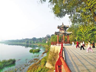 清晨,在故城縣大運(yùn)河國(guó)家文化公園,人們迎著朝陽(yáng)鍛煉身體。河北日?qǐng)?bào)記者 焦 磊攝