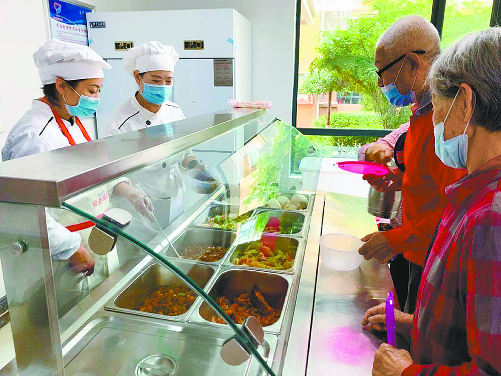 老人們在古城臺街道王府花園助餐服務(wù)點(diǎn)取餐。古城臺街道辦事處供圖
