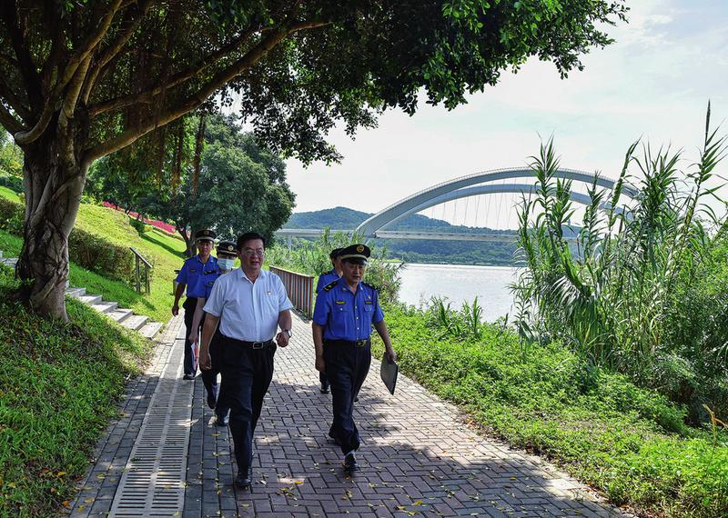 南寧市城管綜合執(zhí)法局局長梁勇(前左一)、南寧市城管支隊支隊長牛繼成(前右一)帶隊巡查邕江沿岸公園(本版圖片均由南寧市城管支隊提供)