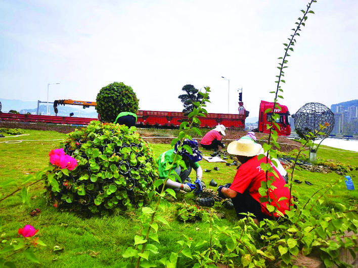 日前,記者在王牌路口節(jié)點(diǎn)看到,園林工人們正在這里換種鮮花,將草坪中間造型上布滿四季海棠,讓鮮花形成鮮艷的花球。在天仙湖攔砂壩,鞍式花箱中替換成了太陽(yáng)花,花朵盛開嬌艷美麗,與仍在綻放的三角梅相映成趣,在城市高樓長(zhǎng)街、萬(wàn)安大橋、一江碧水的大背景下自成風(fēng)景線。