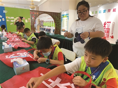 在下午的活動(dòng)中,小記者們來(lái)到城管義工展廳,學(xué)習(xí)用廢棄的橫幅手工縫制環(huán)保袋,積極響應(yīng)“低碳生活”的號(hào)召。許多小朋友都是第一次做針線活,但看到自己制作完成的環(huán)保袋后,充滿了成就感。