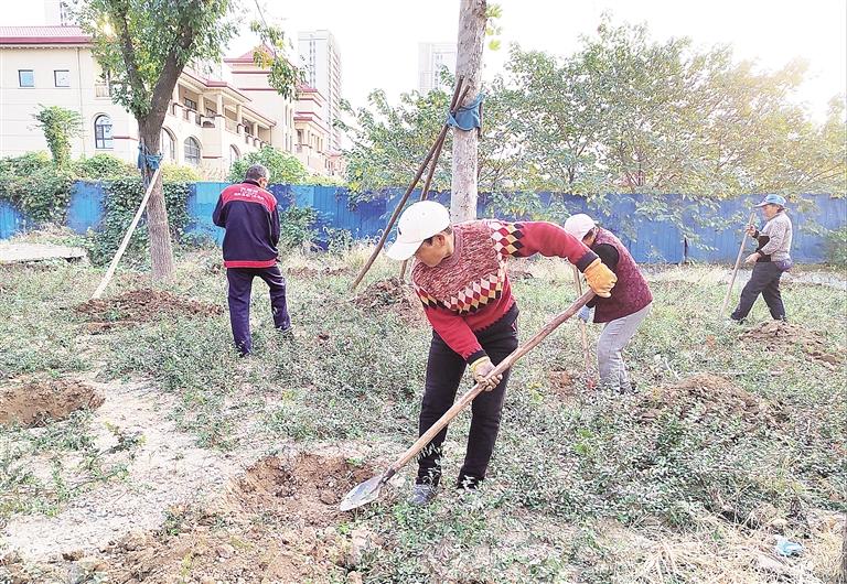 工作人員在路邊綠地內(nèi)補栽綠植(本報記者 鄧嫻 攝)