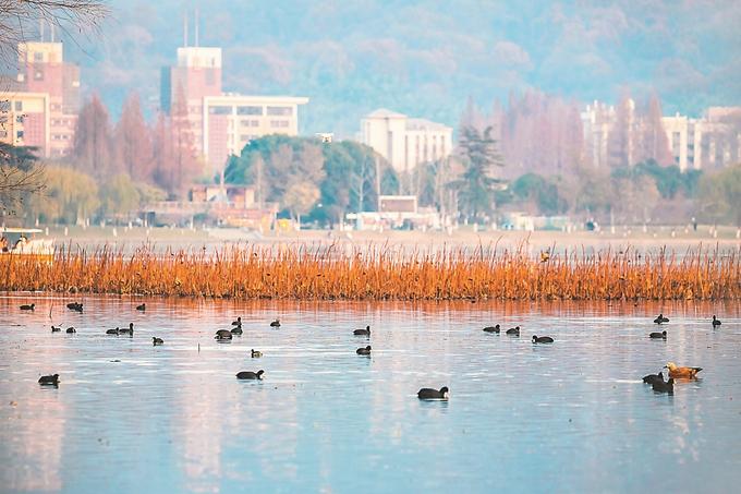 在南京主城,明城墻邊靜臥著一片城中濕地——玄武湖?!敖陙恚跐M足居民休憩游覽功能基礎(chǔ)上,玄武湖也在嘗試進(jìn)行濕地生態(tài)修復(fù)。”玄武湖公園管理處常務(wù)副主任張小軍一邊把湖底的水草和魚蝦指給記者看,一邊介紹,玄武湖在近水區(qū)進(jìn)行生態(tài)修復(fù)實(shí)驗(yàn),保留苦草等水生植物,提升了水質(zhì)清澈度。