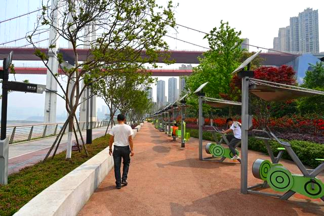 過去,橋下空地有時用于停放車輛、栽種綠植;更多時候,它們被“荒”著,規(guī)劃學界稱之為城市“剩余空間”或“灰空間”。而今在重慶市九龍坡區(qū),橫跨長江的鵝公巖大橋下坐落著生機盎然的九龍灘廣場。市民可在1000平方米的智能健身區(qū)體驗太陽能充電的健身設施,也可在三道貫通的江邊步道親近自然、游玩休憩。