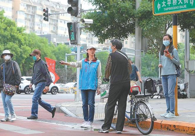 “現(xiàn)在是紅燈,請您站在白線外稍作等候。”來自北京首都創(chuàng)業(yè)集團(tuán)有限公司和東直門街道東外大街社區(qū)的8名青年志愿者正在有序引導(dǎo)過往行人。