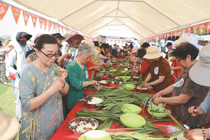 徐州市在大龍湖畔開展端午民俗文化、民俗產(chǎn)品展活動。圖為包粽子比賽。李廣富 攝