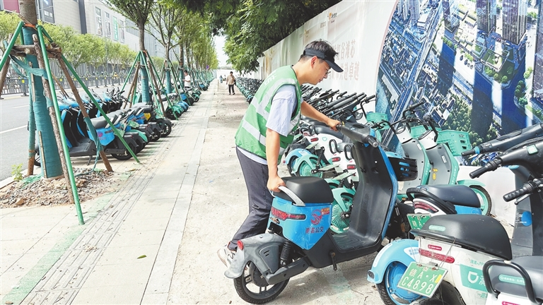 7月20日,南昌市紅谷灘區(qū)萬象路上,早高峰剛過不久,一名穿著綠色馬甲的共享電單車運維人員便忙活開了。與以往不同的是,在他整理的車輛中,不僅有綠色的“自家”車輛,還有藍色、黃色的“別家”車輛。一個小時后,100多輛品牌各異的共享電單車便整整齊齊地停放好了。