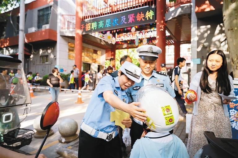 交警在校門(mén)口為遵守“一盔一帶”要求的小朋友貼上“小紅花”反光車(chē)貼。通訊員 孫崇明 攝