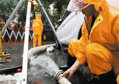 為應(yīng)對(duì)強(qiáng)降雨,天津市各級(jí)排水所組織近1200名排水職工連續(xù)多日晝夜堅(jiān)守崗位,及時(shí)排查、處理暴雨可能導(dǎo)致管道堵塞、涌水峰超負(fù)荷等險(xiǎn)情。上圖 工作人員在東風(fēng)地道打井放水。記者 周偉 攝