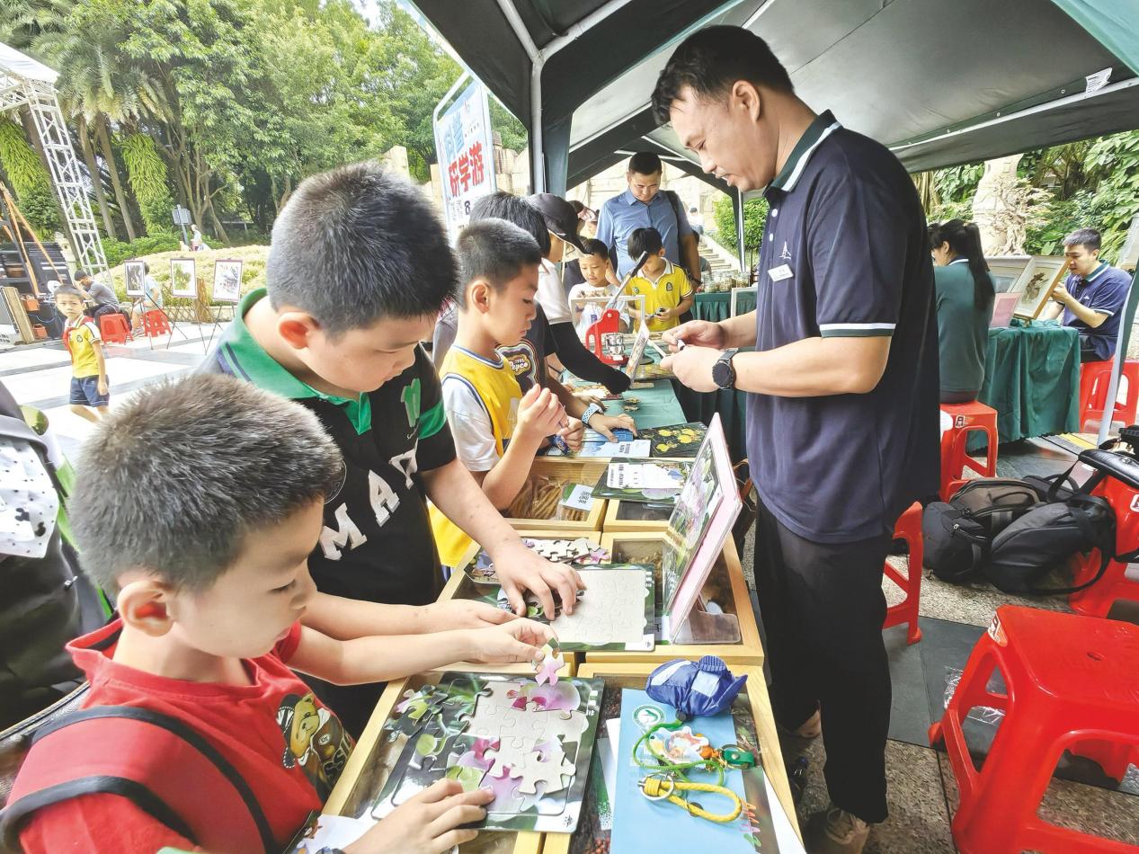 9月9日,2023年廣西野生動植物保護(hù)宣傳月主題宣傳暨南寧市野生動植物保護(hù)宣傳月在南寧市青秀山風(fēng)景區(qū)啟動。圖為小朋友們在自然集市參加互動小游戲。 記者 葉子榕 攝
