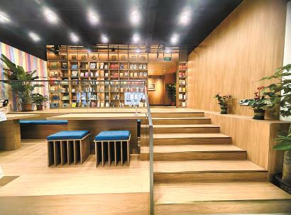 一樓的核心區(qū)域被命名為“紫竹客廳”,一眼望去,擺放著各類組合式桌椅,有居民三三兩兩地坐下閑聊。整排窗的位置被設(shè)計(jì)成長(zhǎng)條吧臺(tái),可供年輕人獨(dú)坐休閑。而大屏幕底下的方塊格子其實(shí)“藏”著一個(gè)個(gè)小方凳,可隨時(shí)拿出來(lái)使用。