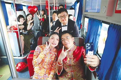 “結(jié)婚當(dāng)天,大家需要張羅的事很多,需要早起,會(huì)擔(dān)心司機(jī)疲勞駕駛,大巴車剛好就解決了這個(gè)煩惱?!比ツ?2月28日結(jié)婚的李媛媛也選擇了大巴車迎親。她說,現(xiàn)在年輕人結(jié)婚,追求婚禮簡約、熱鬧,大巴車安全又環(huán)保就成為他們迎親車輛選擇的重要考慮之一??吹揭灿泻芏嘈氯诉x用大巴車迎親,她和丈夫胡先生也有了嘗試的想法。誰料想,這個(gè)提議得到雙方父母的贊同?!凹依锏挠H戚都很贊同,大家可以坐在大巴車內(nèi)互動(dòng)交流,氛圍非常好。”李媛媛說,與傳統(tǒng)迎親車隊(duì)相比,租用大巴車更加經(jīng)濟(jì)實(shí)惠。