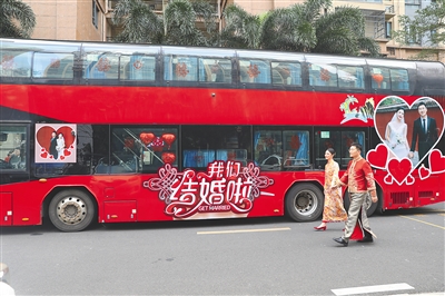在海口關(guān)注大巴車當(dāng)婚車的年輕人并不在少數(shù)。“每周我們都會(huì)接到咨詢電話,我們會(huì)預(yù)留專門車輛運(yùn)營婚車業(yè)務(wù),有雙層觀光巴士也有常規(guī)大巴?!焙?诮煌都瘓F(tuán)公交運(yùn)營分公司運(yùn)營部工作人員李國安介紹,大巴車作為婚車使用,符合綠色出行的環(huán)保理念。婚車的車身和內(nèi)部可以根據(jù)新人要求進(jìn)行個(gè)性化定制。婚車使用當(dāng)天,公司會(huì)安排一名駕駛員和一名管理人員全程陪同,做好相關(guān)后勤保障服務(wù)。