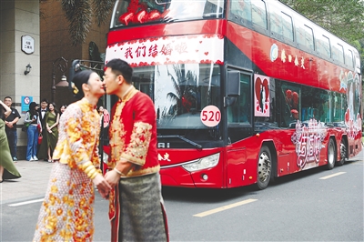 一對(duì)新人在雙層巴士“520專線”前合影。