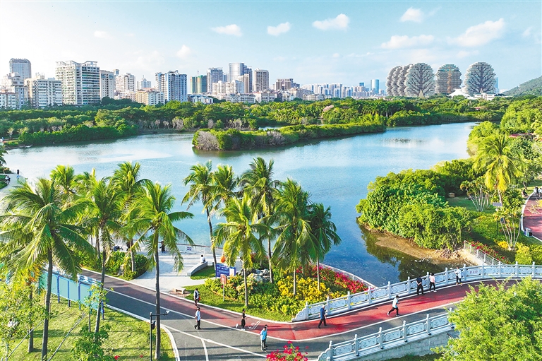 在三亞市白鷺公園里,市民游客漫步在“超級綠道”,呼吸新鮮的空氣,觀賞蔥郁的園林景觀,享受愜意生活。 記者 王程龍 攝
