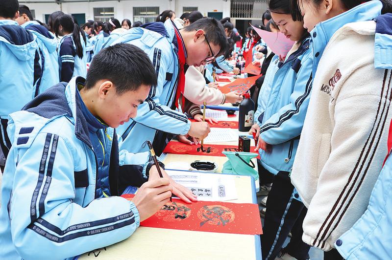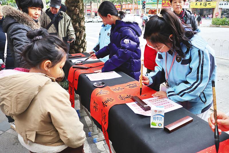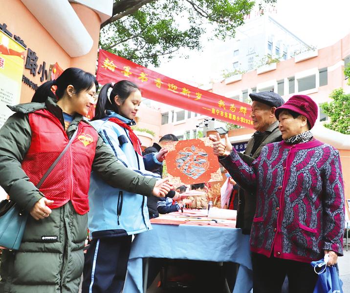 春聯(lián)寓意著人們對美好生活的向往和祝福,既是一種傳統(tǒng)文化的表達,也是一種節(jié)日氛圍的營造,讓人們在新的一年里充滿喜悅和希望。連日來,南寧市各中小學(xué)利用寒假開展形式多樣的活動,組織師生或走上街頭參加志愿服務(wù)活動,為社區(qū)群眾送上新春的祝福,或在家寫春聯(lián)和“?!弊?,為即將來臨的新春佳節(jié)增添濃濃的喜慶氛圍。