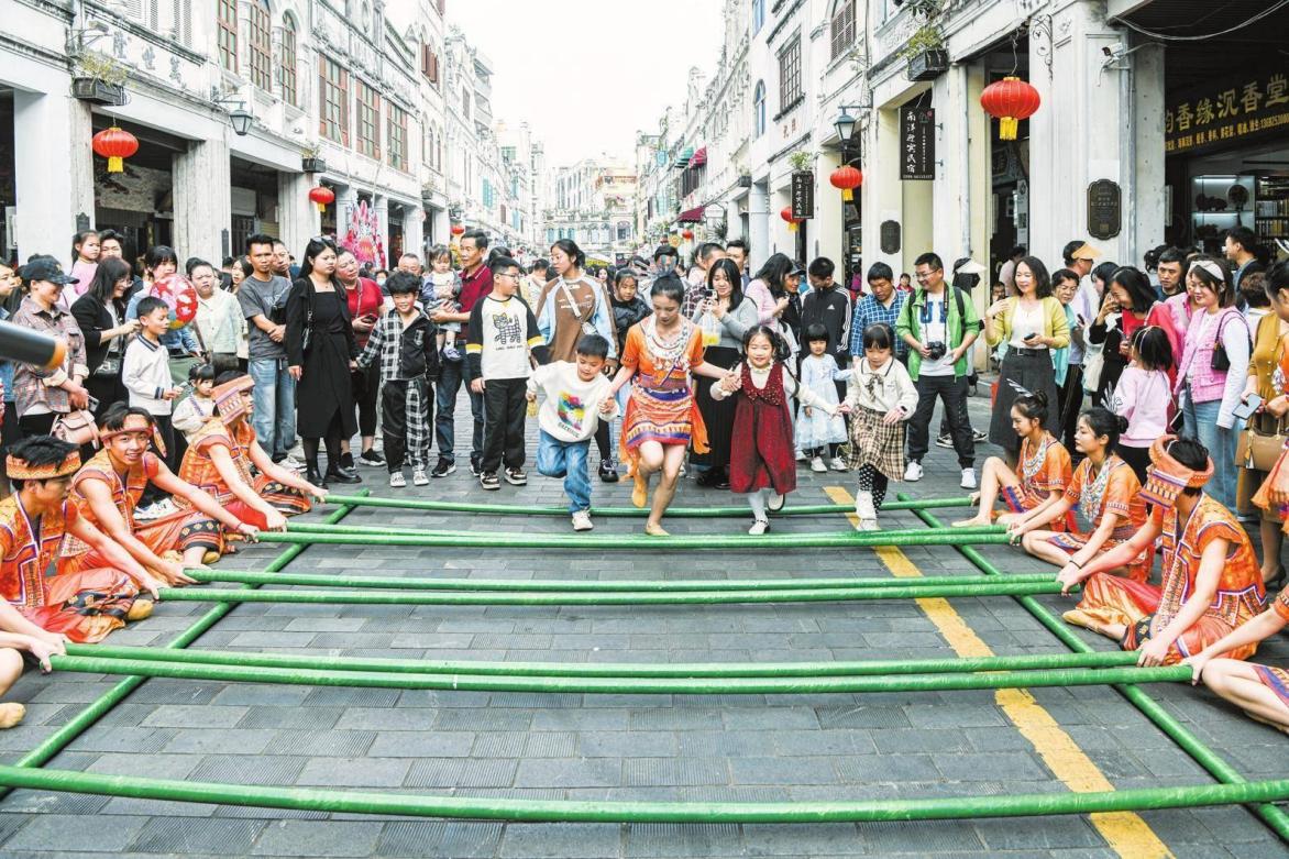 騎樓老街游人如織,傳統(tǒng)竹竿舞吸引不少市民游客參與其中,在歡快的躍動(dòng)間,感受海南傳統(tǒng)民俗的魅力。記者 蘇弼坤 攝