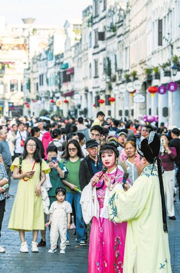市民游客在騎樓老街豐富多彩的節(jié)慶活動(dòng)中,領(lǐng)略??诘奈幕厣兔袼罪L(fēng)情,打卡這個(gè)不容錯(cuò)過(guò)的旅游地標(biāo)。 記者 康登淋 攝