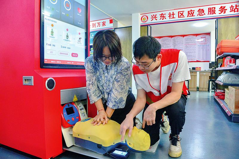 在興東社區(qū)應急服務站,廣西安全生產科學研究院的工作人員利用心肺復蘇急救培訓一體機開展示范教學,并邀請居民實操訓練。記者 黃維業(yè) 攝