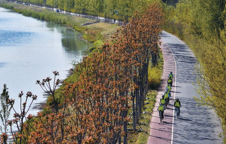 市民沿運河一路騎行,徜徉在大自然中,感受鳥語花香。