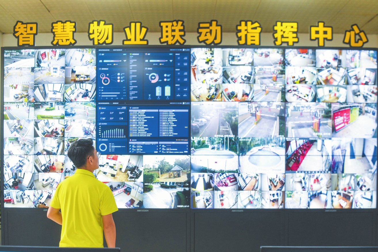 日前,在四季華庭小區(qū),工作人員借助智慧物業(yè)聯(lián)動指揮中心的監(jiān)控大屏查看小區(qū)情況。