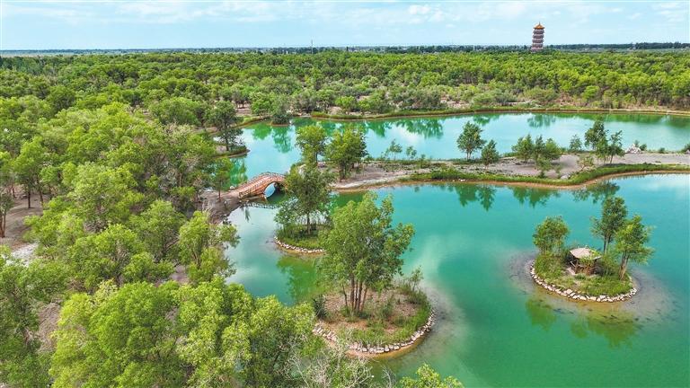 近日,在金塔沙漠胡楊林,清澈的湖水、蔚藍(lán)的天空與綠意盎然的胡楊林,共同繪成一幅夏日?qǐng)D景。通訊員 曹紅祖