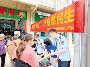 結(jié)合專項(xiàng)整治,在集貿(mào)市場、商超、趕集日、地鐵站出口等人流密集場所舉辦“手機(jī)變砝碼”系列活動(dòng),工作人員使用檢定合格的電子秤對群眾隨身攜帶的手機(jī)進(jìn)行稱重,加貼統(tǒng)一制式的重量標(biāo)簽,讓群眾手機(jī)秒變計(jì)量“砝碼”,并同步演示具體操作流程,為消費(fèi)者復(fù)稱商品重量,講述手機(jī)“變身”后在稱重時(shí)的使用方法;多渠道向廣大消費(fèi)者宣傳識別“鬼秤”的基本方法,普及電子計(jì)價(jià)秤計(jì)量知識,讓廣大消費(fèi)者掌握電子計(jì)價(jià)秤等日常計(jì)量器具的度量、單位換算知識,避免因知識盲點(diǎn)被商家誤導(dǎo)欺騙,活動(dòng)中共“賦碼”手機(jī)560余部,接受群眾咨詢620余人次。