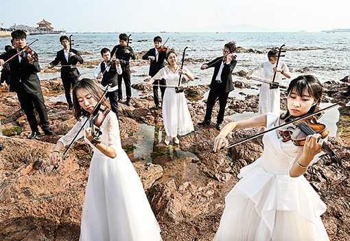 中國海洋大學藝術(shù)系學生在青島市市南區(qū)棧橋景區(qū)演奏(四月十八日攝)。