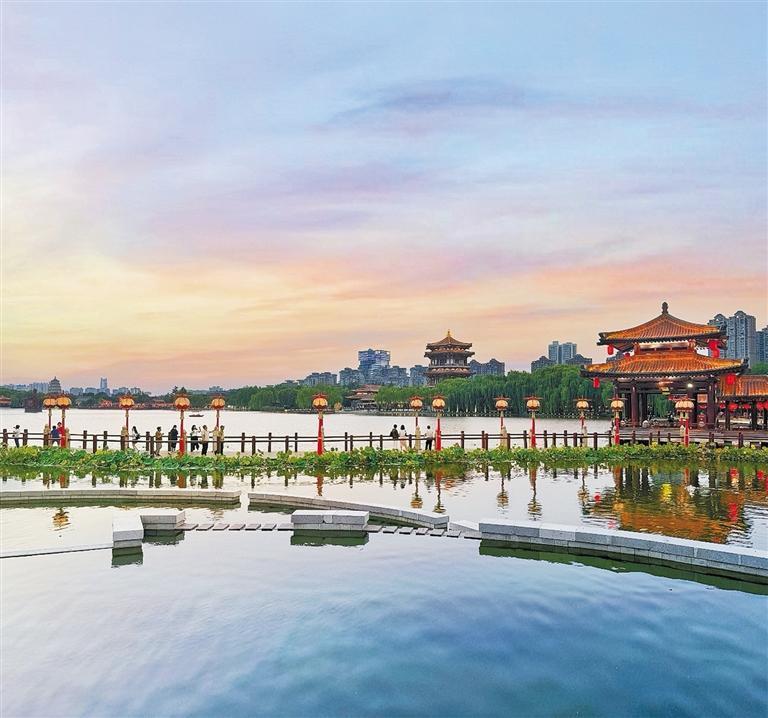 近年來,西安曲江池·大唐芙蓉園水利風(fēng)景區(qū)貫徹落實(shí)河湖長制,構(gòu)建完善管理體系,有效提升河湖管理效率與動(dòng)態(tài)監(jiān)管能力,同時(shí)注重水資源集約利用,水環(huán)境保護(hù)治理取得顯著成效?!拔姨貏e喜歡這里的文化氛圍。水舞光影秀《大唐追夢(mèng)》太震撼了!站在湖邊,濃郁的盛唐文化氣息撲面而來,令人心曠神怡?!眮碜陨虾5挠慰蛥翘煊畋硎?,這樣的體驗(yàn)讓他更加喜歡西安。