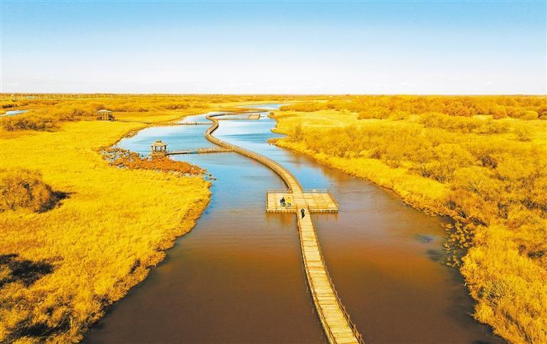 10月12日拍攝的黑龍江省撫遠市黑瞎子島國家濕地公園。金秋時節(jié),濕地兩岸披上金色“外衣”,景美如畫。記者 高興貴攝