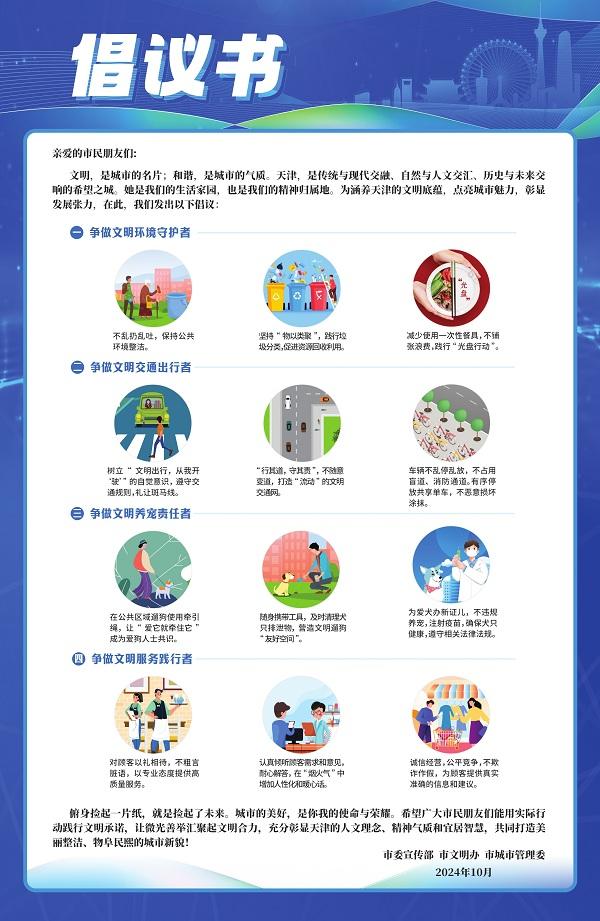 “俯身?yè)炱鹨黄垼褪菗炱鹆宋磥?。城市的美好,是你我的使命與榮耀?!碧旖蚴形麄鞑?、市文明辦、市城市管理委10月29日向全市發(fā)出倡議,號(hào)召人人爭(zhēng)做文明環(huán)境守護(hù)者、文明交通出行者、文明養(yǎng)寵責(zé)任者、文明服務(wù)踐行者,以自身的文明行為充分彰顯天津的人文理念、精神氣質(zhì)和宜居智慧,共同打造美麗整潔、物阜民熙的城市新貌。