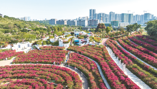 紅色的三角梅花海與城市高樓交相輝映。彭寰 攝