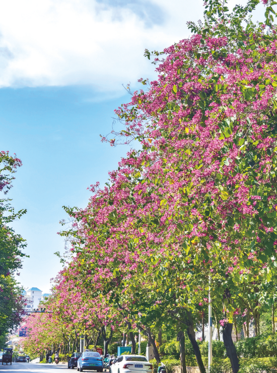 秋風(fēng)拂過,城市各條道路、橋梁兩旁,綠樹和各色花朵相互映襯,演繹著專屬綠城的秋日浪漫。綠城南寧,“綠”是不變的底色。民族大道兩旁,異木棉花開一路,在綠樹映襯下分外美麗。古城路綠樹成蔭,機(jī)動車、行人穿行其間,陽光從樹葉間灑下。百花嶺路兩旁的羊蹄甲花競相開放,讓道路變成了花廊。邕城秋色中,又怎能少得了三角梅?良慶大橋上的三角梅熱情綻放,與從江上駛過的船只構(gòu)成了一幅寫意的畫卷……(記者 覃雨軒)