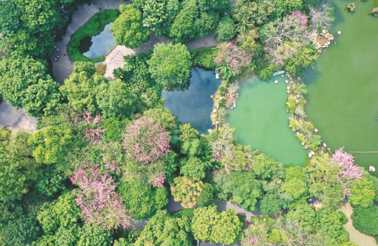 民族廣場上,孩子們在秋日暖陽下奔跑、與鴿子嬉戲;五象湖公園內(nèi),時(shí)??梢娛忻襁\(yùn)動的身影,處處充滿無限的生機(jī)與活力;獅山公園里,落羽杉換上金黃色的“新衣”,仿佛秋天的使者,向人們傳遞季節(jié)的更迭;南湖公園里,蒜香藤形成紫色“瀑布”,讓人仿佛進(jìn)入一個(gè)紫色的夢幻世界;青秀山風(fēng)景區(qū)層林盡染,人們在葉子花園里拍照打卡,在金杉湖邊漫步……