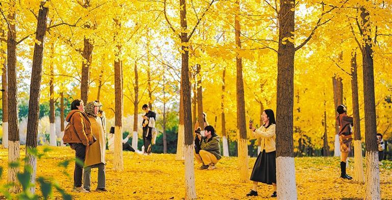 11月3日,市民游客在北京奧林匹克森林公園銀杏林樂享秋日美好時(shí)光。