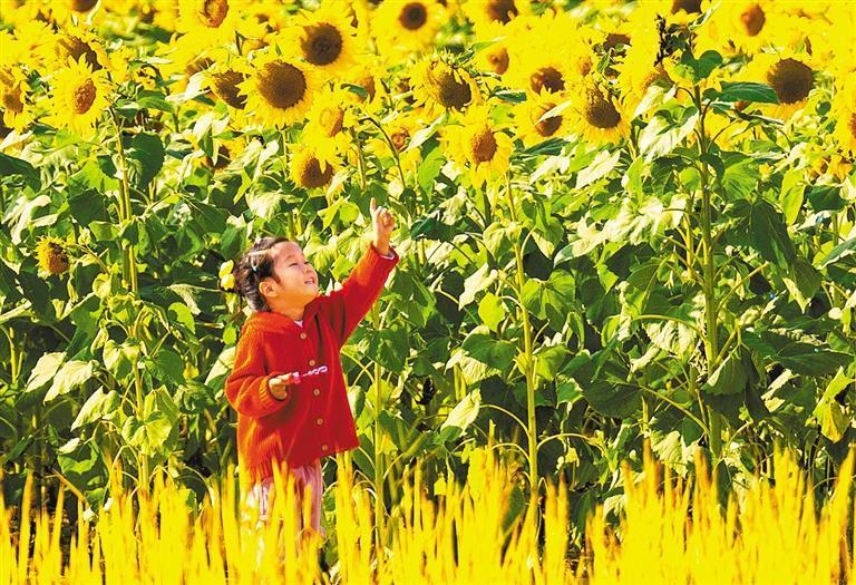10月29日,小朋友在北京溫榆河公園“蕓上梯田”景區(qū)觀賞向日葵。