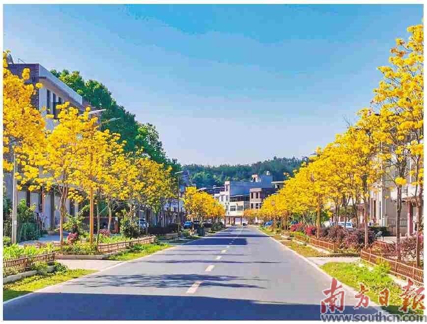 畬江鎮(zhèn)道路兩旁的黃花風鈴木美麗綻放。受訪者供圖