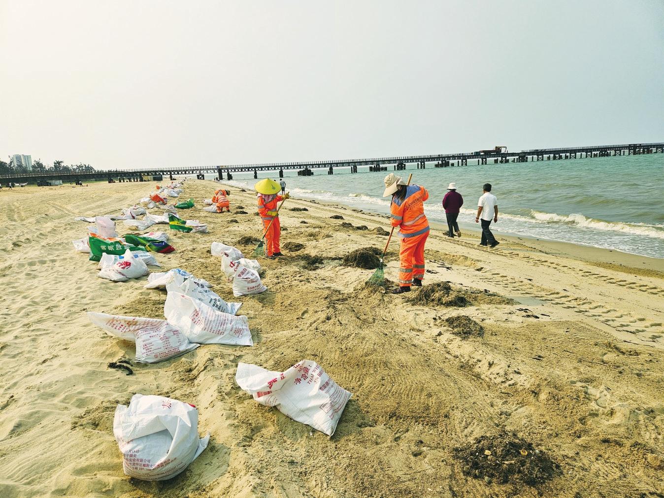 海口玉禾田公司提前清潔海灘營(yíng)造整潔環(huán)境。廖志琴 攝